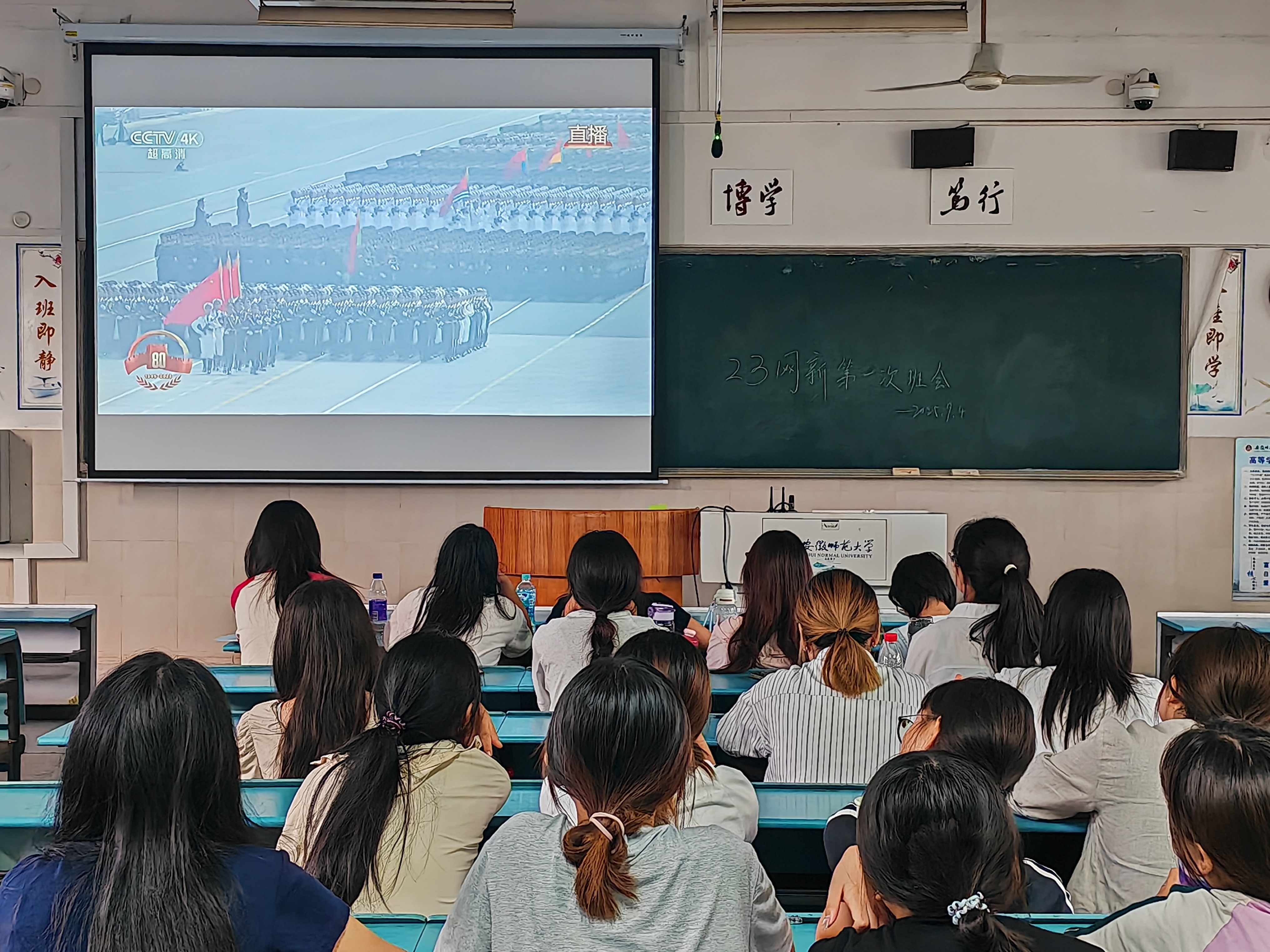 班会伊始,全体同学集体观看了“9·3”阅兵视频。辅导员汪笑笑借此契机,引导同学们感受祖国的日益强大和军人的忠诚担当,将爱国主义的种子播撒在每位同学的心田,激发大家作为新时代青年的自豪感与责任感。随后,聚焦安全教育,辅导员汪笑笑全面讲解了宿舍安全卫生、防范电信网络诈骗以及交通安全等安全知识,将安全意识深植于每位同学心中。
