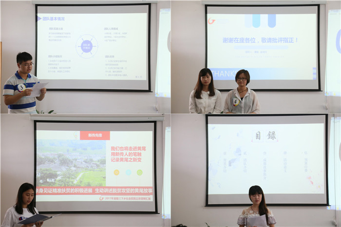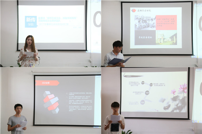各支暑期社会实践团队依次上台汇报并进行现场答辩。爱心中转站赴芜湖市区调研环卫工人现状暑期社会实践团队表示“我们想让更多的人知道这样一个群体需要关注,需要理解。”“赴婺源探寻传统建筑,记录古村之魂”暑期社会实践团队则目光投向了日益消逝的古村落上,“我们希望自己不仅仅是婺源古村落现状的调研者,更是保护古村落思想的传播者和古村落现状的保护者。”“心藏一份人文关怀,脚沾一些乡野泥土”,为结合建军九十周年主题,实地调研“小三线”建设,探索现代民宿的现状,赴皖南“寻迹家国情怀,感知现代乡愁”暑期社会实践团队将前往黄山奔赴三年之约,纪念军魂恒久,撒播知识大种,跟随时代脚步,感知现代乡愁。“一次扶贫主题行,一次素养大练兵”,赴皖西“聚焦脱贫攻坚,躬听黄尾故事”暑期社会实践团队将扛起志愿服务的大旗,付诸最热忱的实践,奔赴在脱贫攻坚的最前线,汇报人来妤婷最后说道:“这个社会始终需要有深度、有温度、有厚度的新闻人和新闻故事,尽管力量微薄,却是大学生为助力精准扶贫事业献出的一份热忱。”