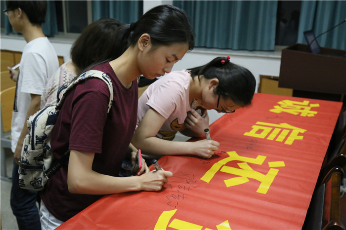 最后,同学们分批依次上台,在学院特制的横幅上签下“守信负责,饮水思源”的青春承诺,并下定决心在今后的学习、生活中将这些宝贵品质内化于心,外化于行。