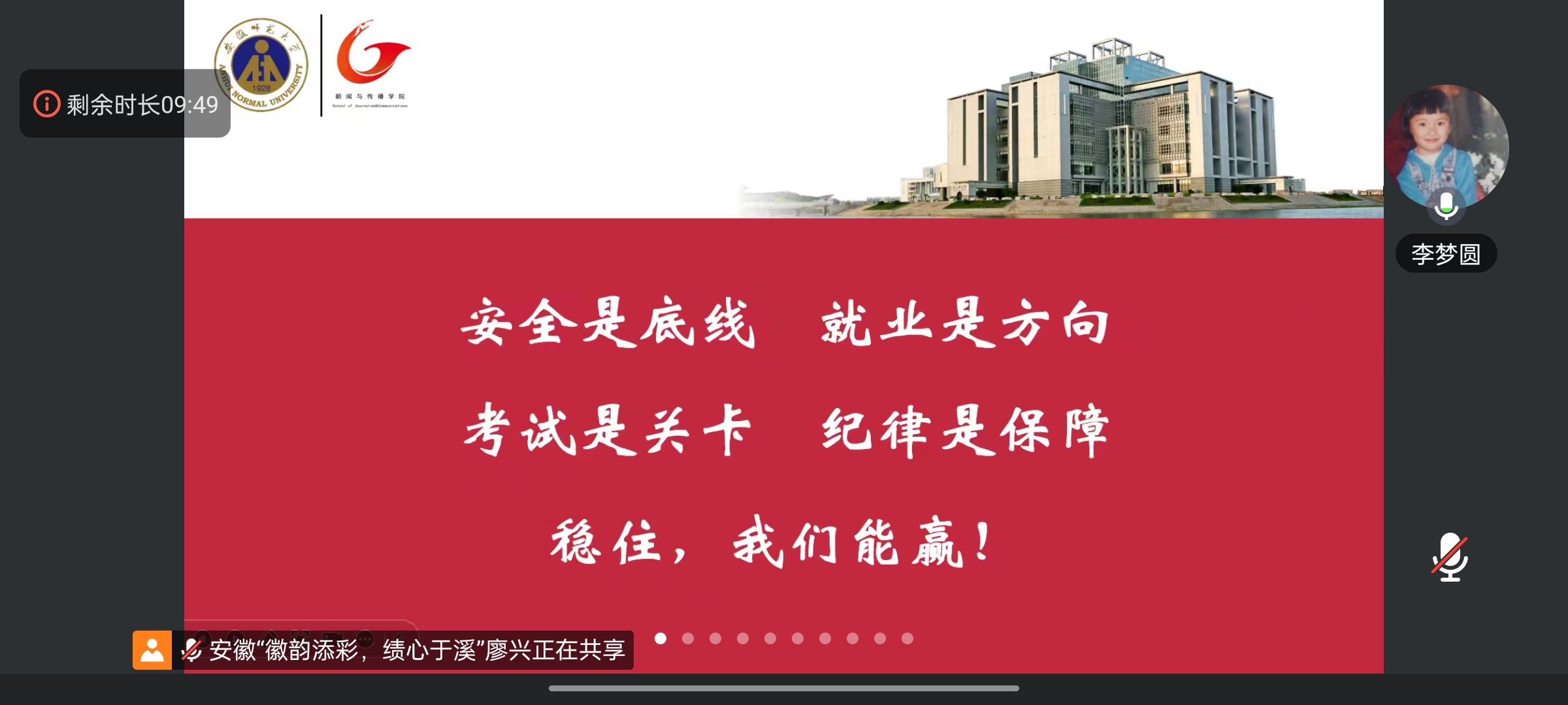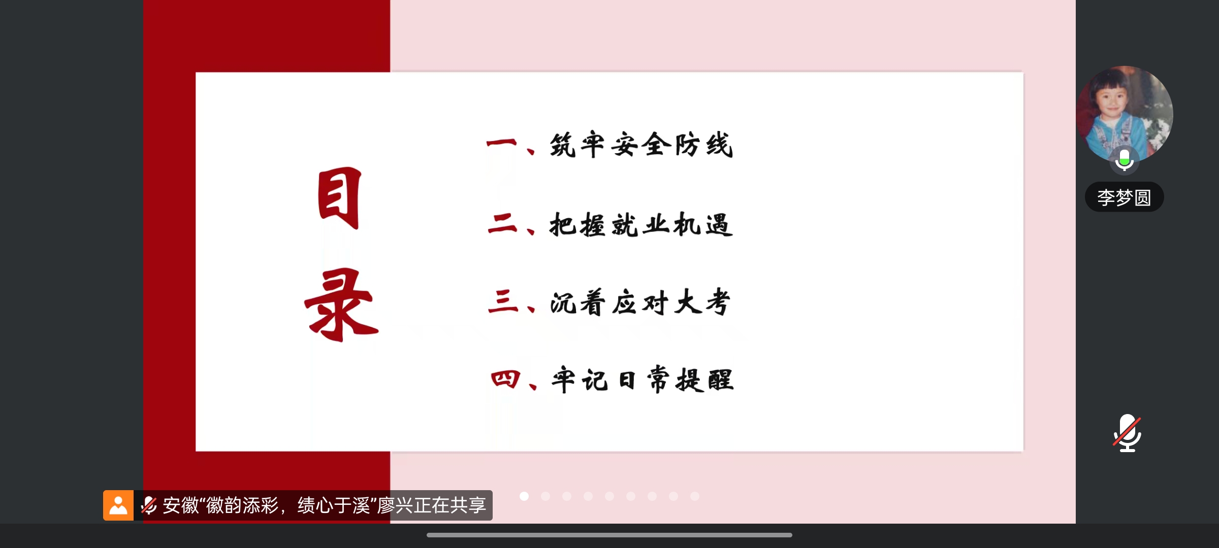 9月30日,2022 级新广网播专业辅导员李梦圆面向全体同学召开主题班会,以“安全筑基、就业领航、备考暖心”为核心,为同学们梳理毕业季重点任务,以细致指导筑牢毕业季“防护网”。