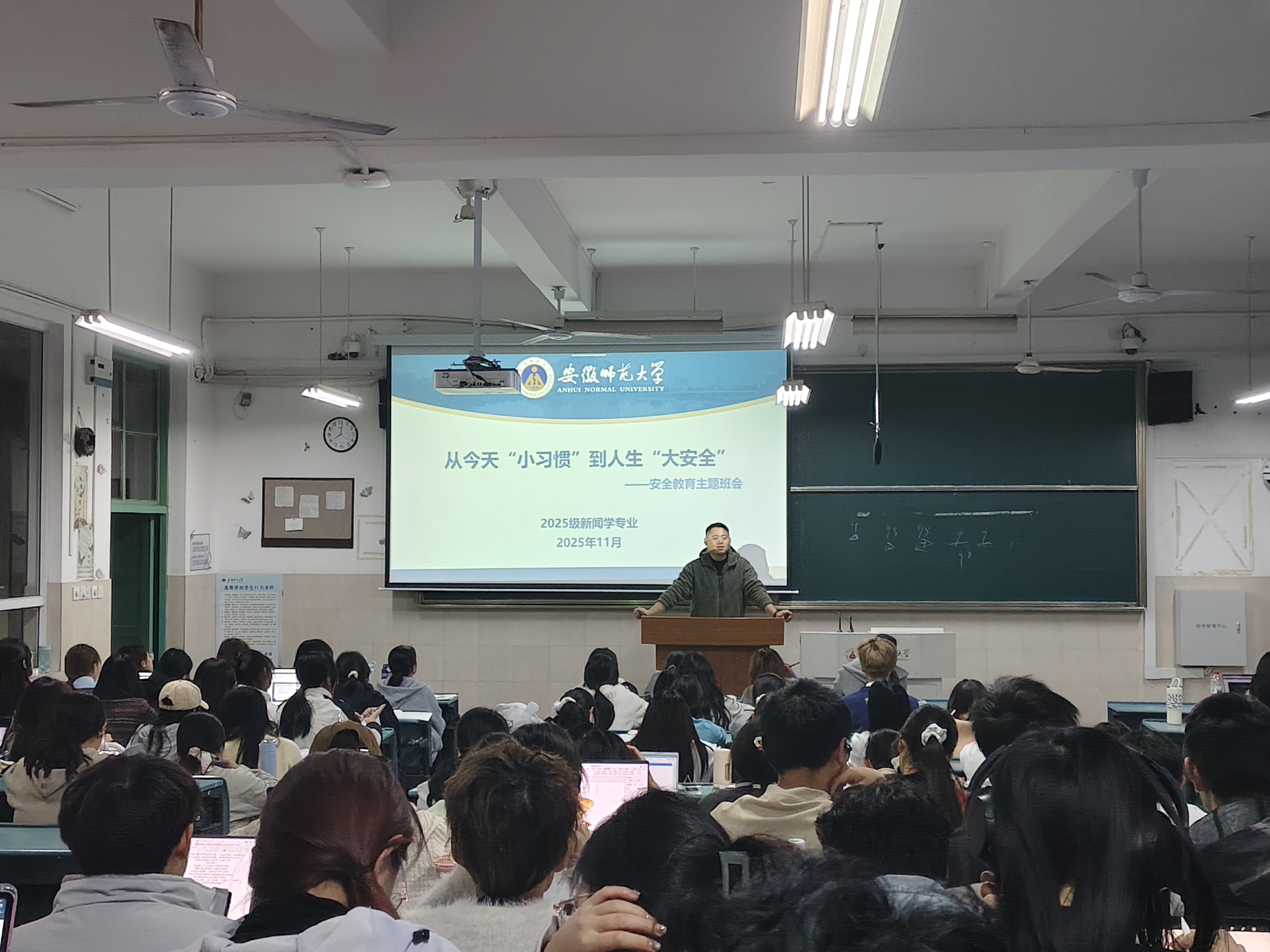 本网讯(bat365在线中国登录入口 陈雨婷 欧阳如意)为切实增强学生安全意识,筑牢校园安全防线,2025年11月10日晚,2025级新闻学、广告学专业分别于行知楼教室召开安全教育主题班会。会议由辅导员刘成俊主持。