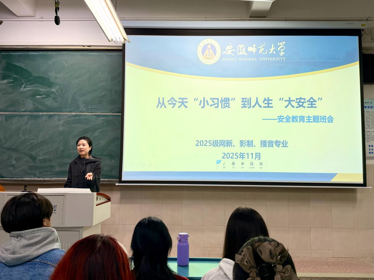 本网讯(bat365在线中国登录入口 杨佳琪)为切实增强学生的安全防范意识,共建安全、和谐、稳定的校园环境,11月13日,2025级网络与新媒体、播音与主持艺术、影视摄影与制作三个专业全体同学在行知楼2040304教室召开题为 “从今天小习惯到人生大安全” 的安全教育主题班会。班会由辅导员郑慧玲主持。