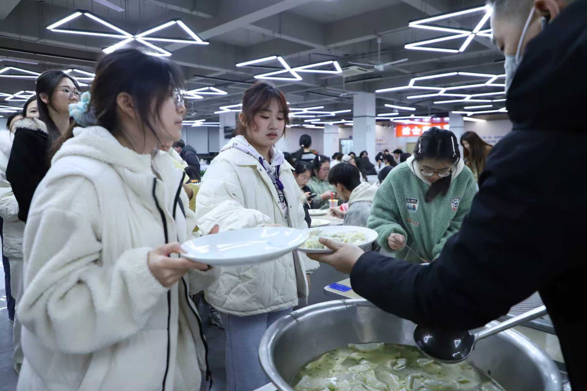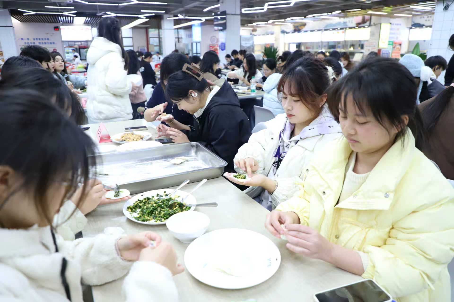 食堂工作人员也在一旁给予指导,分享传统饺子的制作要领。下午5时左右,同学们已经包好了近千个饺子。这些饺子随后被送入食堂厨房统一烹煮。当热气腾腾的饺子端上餐桌时,同学们品尝着自己的劳动成果,脸上洋溢着满足的笑容。