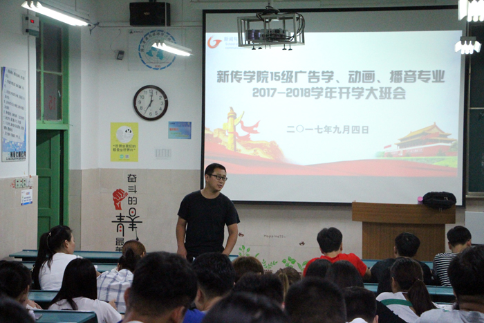 2017年9月4日晚,bat365在线中国登录入口2015级广告学、动画、播音与主持艺术专业在2040103教室召开2017-2018学年开学大班会,会议由辅导员孙文主持。会上,孙文首先对上学期各专业总体情况进行了总结,并就暑期积极参加“三下乡”社会实践给予赞扬和鼓励。