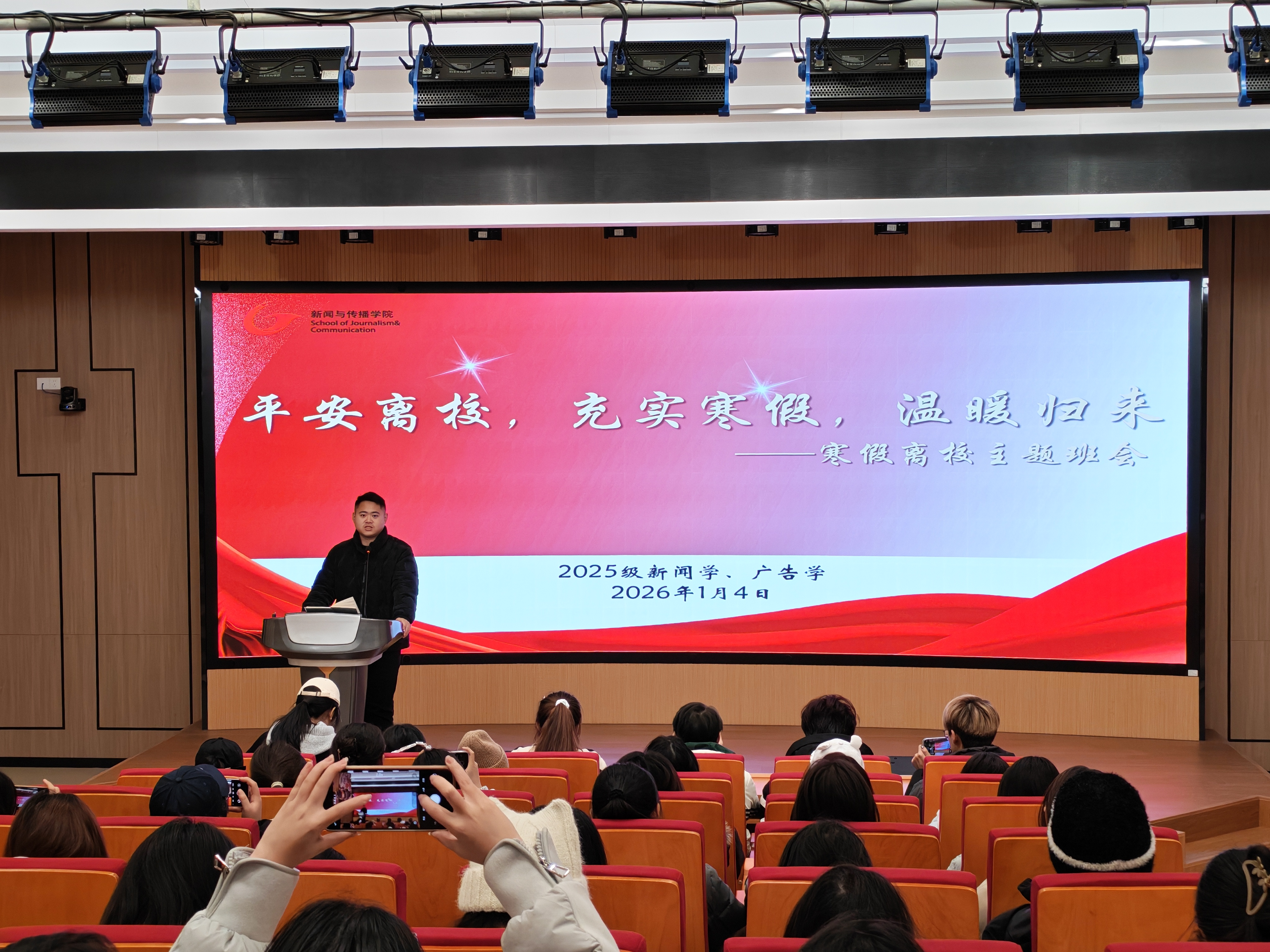 本网讯(bat365在线中国登录入口 陈雨婷)2026年1月4日下午,2025级新闻学、广告学于望道楼102会议室召开寒假离校主题班会,全体同学参会,会议由辅导员刘成俊主持。