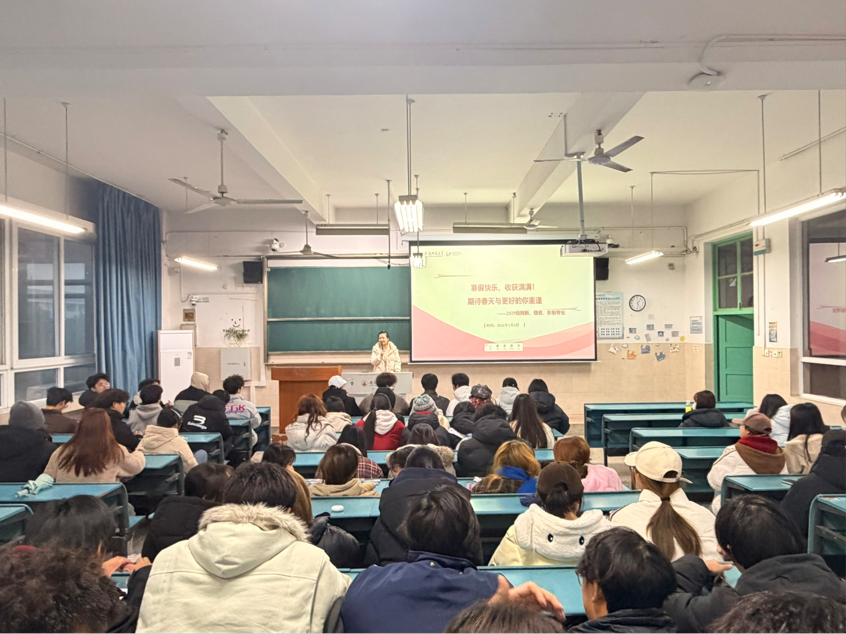 班会上,郑慧玲首先向同学们明确了寒假放假时间安排,并对离校报备制度、返校报到要求等作了详细说明,提醒同学们严格遵守学校规定,按时办理离校与返校手续。随后,她重点围绕网络安全、宿舍安全、交通安全、财产安全等方面进行了细致讲解,叮嘱同学们牢固树立安全观念,提高自我保护能力。