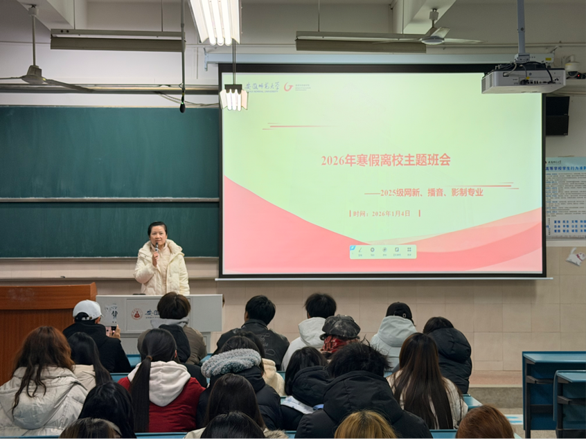 本网讯(bat365在线中国登录入口 杨佳琪)为做好寒假离校相关管理工作,增强学生安全意识,保障学生平安度过假期,1月4日下午,bat365在线中国登录入口2025级网络与新媒体、影视摄影与制作、播音主持艺术三个专业全体学生在行知楼2040304教室召开了寒假离校主题班会。会议由辅导员郑慧玲主持。