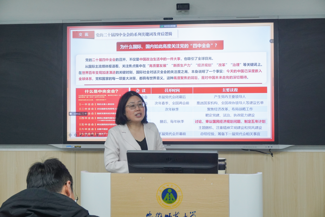 首先,马梅以“贯彻落实党的二十届四中全会精神,为宣传思想文化工作贡献青年力量”为题授专题党课。她围绕党的二十届四中全会关于宣传思想文化工作的重要部署,结合新闻传播与播音主持专业特点,从“把握全会精神核心要义”“找准青年担当切入点”“立足专业践行文化使命”三个维度展开解读。马梅指出,宣传思想文化工作是凝聚人心、汇聚力量的重要工程,新时代青年党员要牢记“举旗帜、聚民心、育新人、兴文化、展形象”的使命任务,将专业所长与国家需求紧密结合,在新闻采写、语言传播、文化传承中坚守正道、勇于创新,用青春之声讲好中国故事、传播中国声音。