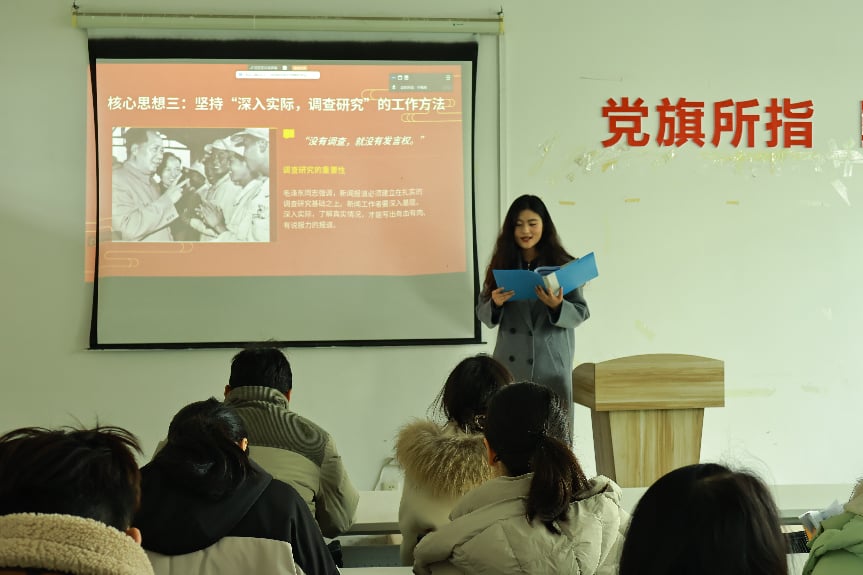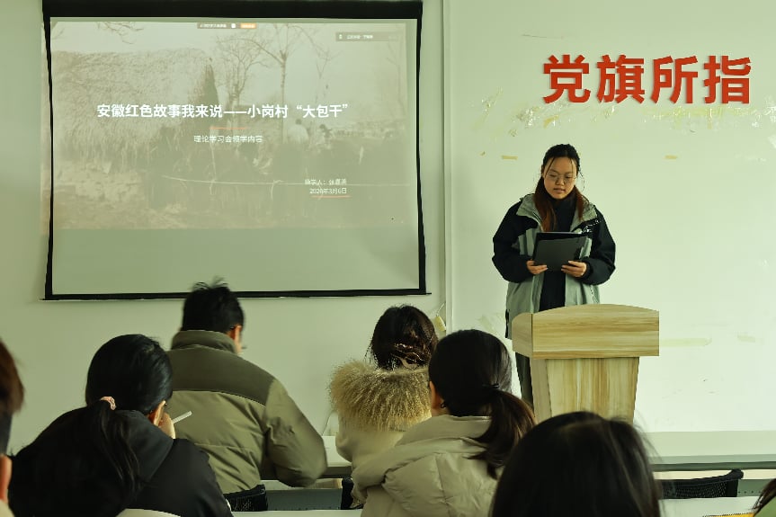 会上,殷辰旭同学围绕《毛泽东新闻工作文选》开展领学。她从“坚持政治家办报的原则”“坚持全党办报、群众办报的方针”“坚持深入实际调查研究的工作方法”三个核心思想切入,系统阐释了毛泽东新闻思想的核心内涵。随后,张嘉美以安徽凤阳小岗村“大包干”精神为核心,讲述江淮大地上的红色实践。她从安徽作为鄂豫皖苏区重要组成部分、新四军抗日根据地核心区域的历史定位切入,讲述了铁军精神、淮海战役支前精神、渡江精神、大别山精神的孕育与传承,重点回顾了凤阳小岗村“大包干”的改革历程,深刻解读了“敢闯敢试、敢为人先、实事求是、求真务实”的大包干精神,阐明其对中国改革开放进程的深远影响。