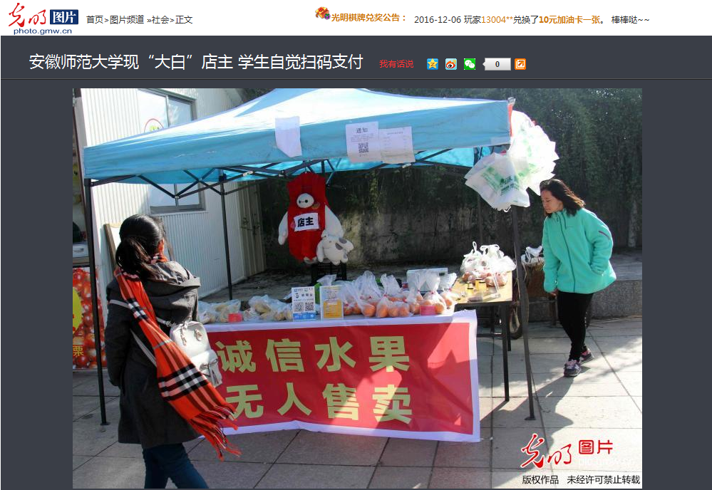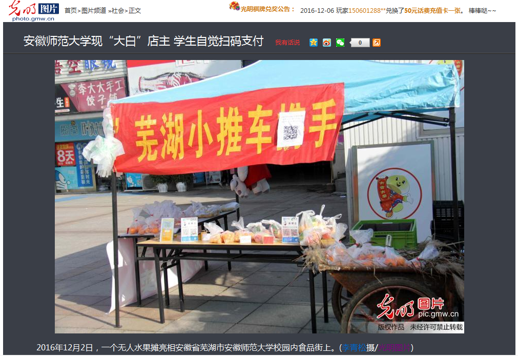 近日,《光明网》在专栏《光明图片》中图文并茂地报道了bat365在线中国登录入口2015级空乘专业学生诚晨带领“芜湖小推车”的创业伙伴一起与“芜湖爱净菜”平台合作,在师大小食代广场前进行了无人诚信水果售卖的试点活动。同学们通过支付宝扫码付款和微信转账的方式购买水果,而店主则是大家熟悉的卡通人物大白。青春有为,创意无限。此次的诚信创意售卖活动进行得十分顺利,学校的相关部门给予了创业政策和场地的支持,而作为活动组织者的bat365在线中国登录入口2015空乘专业的诚晨也和同学们在活动开展中锻炼了创业实战能力。