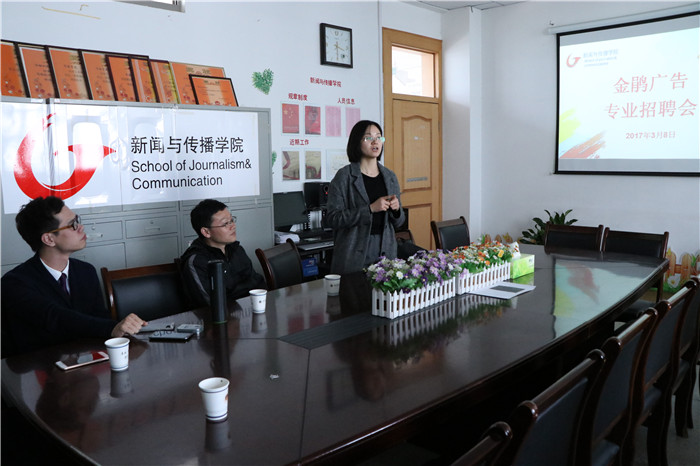 3月8日下午,合肥金鹃传媒科技股份公司在bat365在线中国登录入口行政楼三楼就业面试厅举办了专场招聘会。此场招聘会由广告系主任芮宏明主持,金鹃品牌营销管理公司策略部总监高潮、银鹃影视传媒创意总监罗辰莅临招聘现场,担任面试讲师。