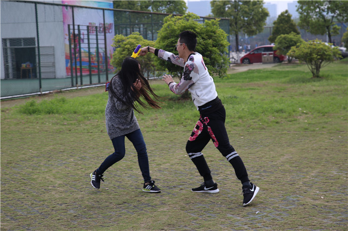最后登场的游戏是前不久炙手可热的撕名牌,这无疑是本次活动的重头戏。同学们分为两队,寻找事先隐藏的水枪,并利用找到的水枪喷射对手的名牌,名牌被喷到则变色既被淘汰,最后胜利的人获得酸奶一箱。在小组对抗的规则下,同学们的竞争意识更加激烈,让这次充满友谊的比赛高潮迭起,精彩不断。最后,在游戏中获得“升级”的同学领取了自己的奖品,同学们在游戏中赢得的不仅是奖品,更是快乐。