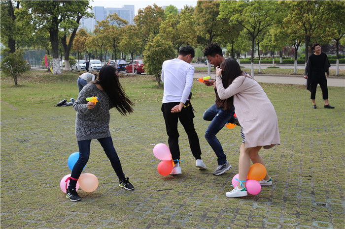 放风筝结束后,同学们又开始了趣味十足的踩气球竞赛。同学们两人一组,共分为四个小组,每人在脚上绑三个气球,互相对他人的气球进行“攻击”,将气球保留到最后的小组获胜。这虽然是一个简单的游戏,但同学们在游戏中放松了身心,尽情享受到了游戏的乐趣。游戏后,同学们将残留的气球碎片拾起,统一处理,不忘保护校园的整洁。