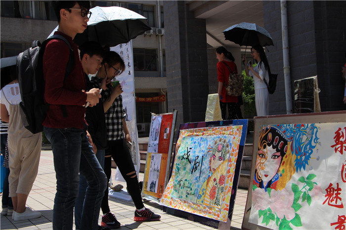 5月11日,bat365在线中国登录入口学生会技术部联合文学院学生会宣传部、赭麓书画社于花津校区二食堂门前广场成功举办了以“弘扬传统文化,领略戏曲魅力”为主题的第六届“两院一社”海报展。bat365在线中国登录入口团委副书记郁悦、14级辅导员孙月婷亲临现场观看了海报展。