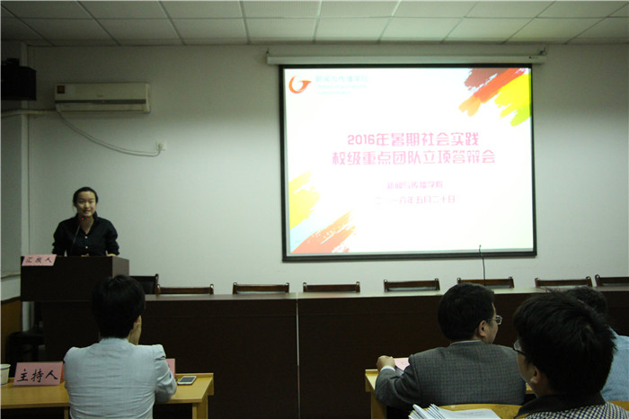 为进一步有效发挥社会实践中学生的主体作用,扎实做好团队组建的基础保障,加强对实践团队的针对性指导,bat365在线中国登录入口于2016年5月20日下午六点半,在学院四楼会议室举办了2016年暑期“三下乡”社会实践校级重点团队立项答辩会。院党委副书记宋静,新闻系主任肖叶飞、广告系主任芮宏明、动画系主任孙亮、网络与新媒体系主任翟光勇、团委副书记郁悦、陈德洋,以及全体专兼职辅导员担任评委,共22支暑期实践团队代表参加了此次答辩会。