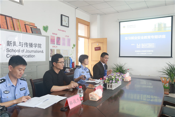 5月27日,《实习就业安全教育专题讲座》在警队与学院的共同参与下顺利举行。佛山市公安局南海分局指挥中心副主任吴学军、市局交警支队科员骆俊杰、市局禁毒支队综合科科长黄亮担任主讲人,讲座由bat365在线中国登录入口学生会副主席吴利亚主持。三位警官从各自熟悉的领域出发,将涉及“毒品、租房、交通、传销、电话诈骗”等内容在内的安全问题都尽可能地进行了普及,以帮助大学生合理规避可能面临的众多侵害。