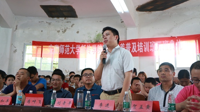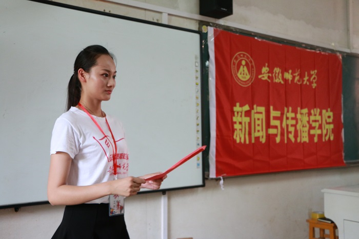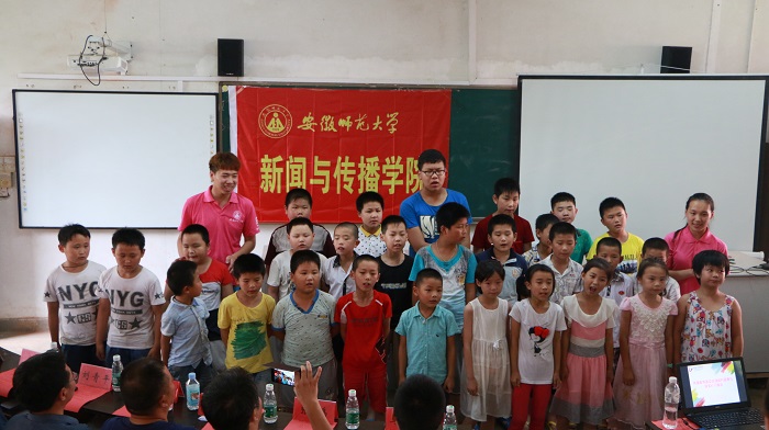 7月11日,bat365在线中国登录入口赴宿松暑期社会实践服务团队在凉亭镇三德村的“传媒素养普及培训班”开班典礼暨家长见面会在光荣初中阶梯教室举行。凉亭镇副镇长刘青平、三德村党总支副书记高和丰、bat365在线中国登录入口新闻系主任肖叶飞、光荣中学副校长贺孟黄、学校驻凉亭镇三德村第一书记、扶贫队队长李进、光荣初中张鹏主任及团队指导老师马星宇、孙文出席。典礼仪式由孙文和2014级播音与主持专业的郭雅迪同学主持,全体学生、志愿者及部分学生家长参加。