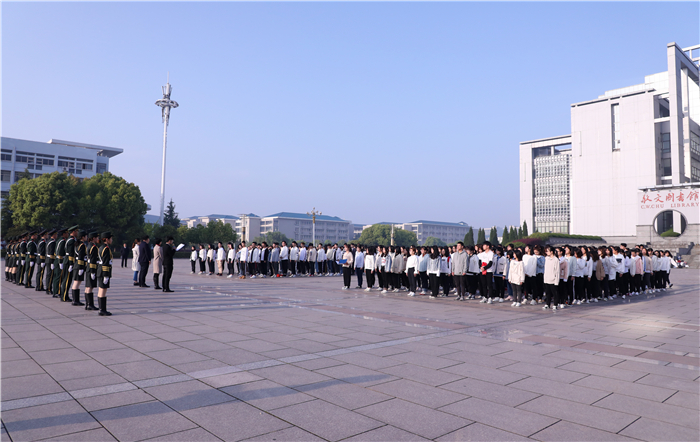 七时许的初晨,bat365在线中国登录入口2018级本科生列队严整,精神饱满,肃然站在敬文图书馆东广场上。迎着初阳,校国旗护卫队迈着铿锵齐整的步伐走向国旗台,将国旗交予升旗手,伴着《义勇军进行曲》的激昂旋律,升旗手有力地振臂、拉绳、上昂……全体师生奏唱国歌,行注目礼目视国旗冉冉升起。