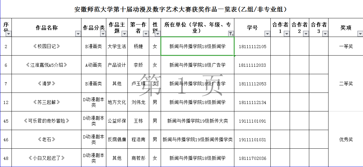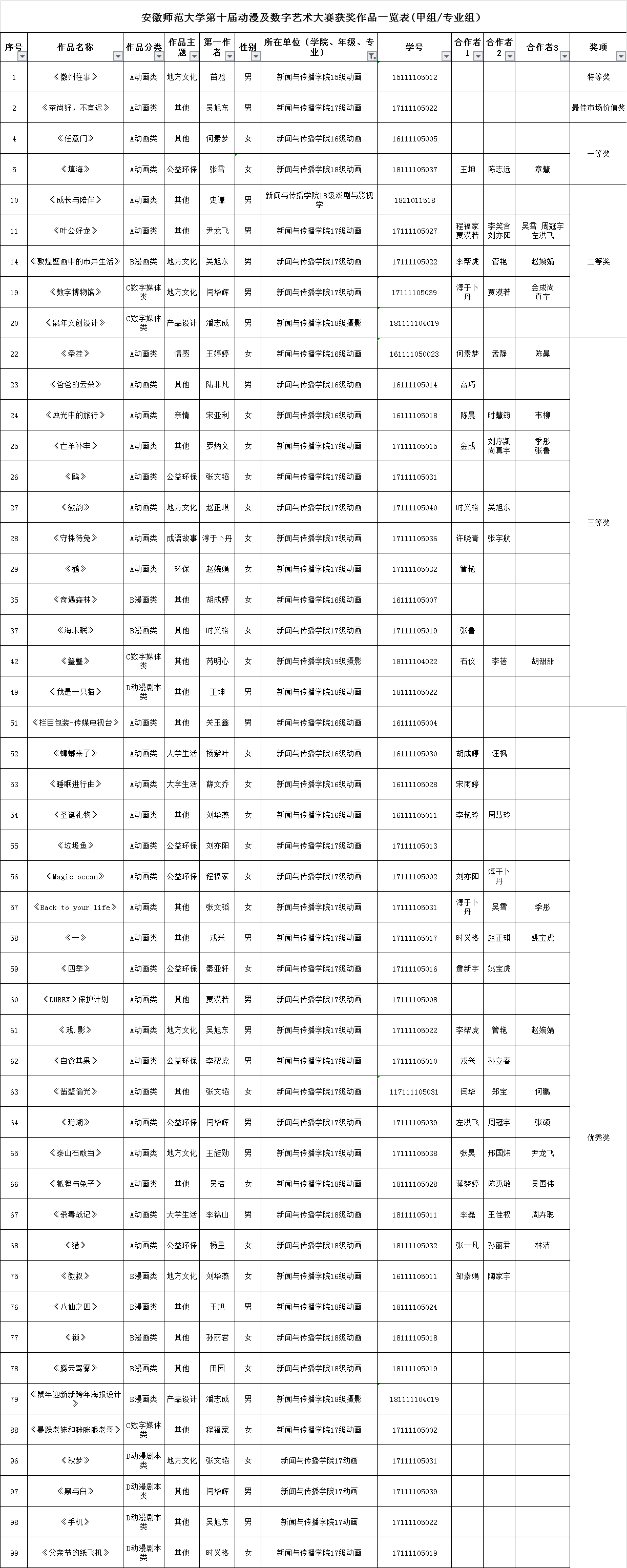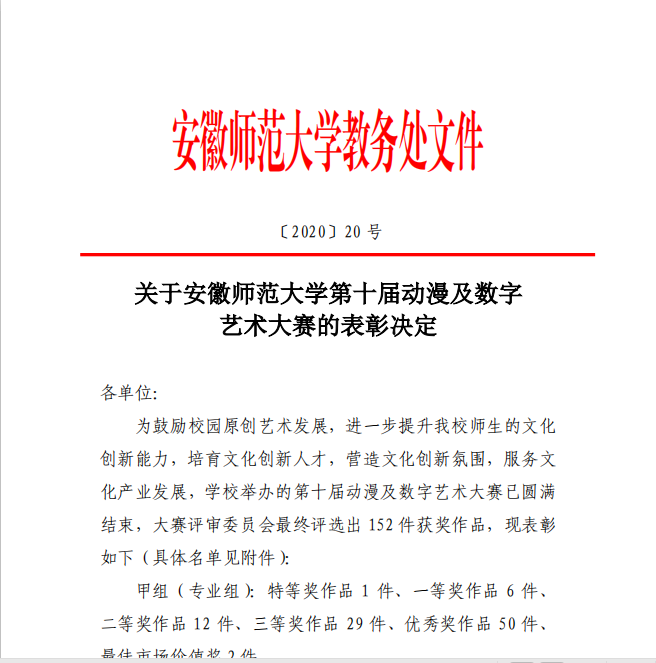 本次比赛参赛作品类型包含动画类、漫画插画类、数字媒体类、动漫剧本类以及动漫配音类五个类别。新传学子创意无止境,秉持“新传出品,必是精品”的信念,每个类别均出佳作。15级苗驰的《徽州往事》地方文化主题作品获特等奖、17级动画吴旭东的《茶尚好、不宜迟》动画类作品获最佳市场价值奖、18级新闻学杨婕的《校园日记》大学生活主题作品一等奖、18级广告学卢玉璞的《清梦》漫画类作品获二等奖、18级摄影潘志成《鼠年文创设计》数字媒体类作品获二等奖、17级动画时义格《父亲节的纸飞机》动漫剧本类作品获优秀奖。
