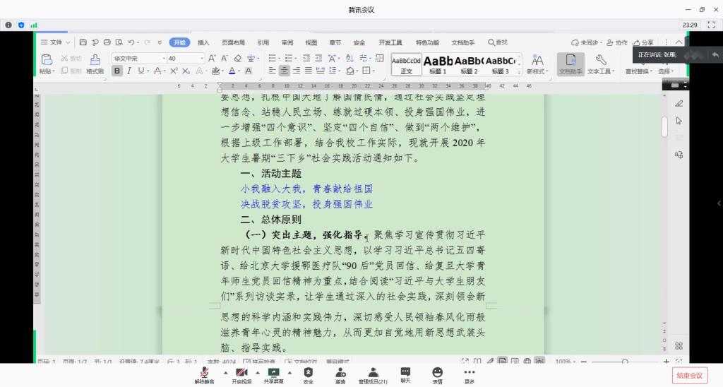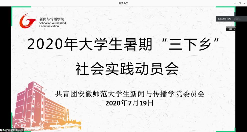 (本网讯 院团委学生会宣传部徐德欣)为引导广大青年学生深入学习贯彻习近平新时代中国特色社会主义思想,在统筹推进新冠肺炎疫情防控和经济社会发展背景下,引导青年学生参与属地化、常态化的社会实践活动,7月19日下午,bat365在线中国登录入口在腾讯会议平台举行了2020年大学生暑期“三下乡”社会实践动员会。院团委书记张雁参与并主持会议,2018级、2019级各班团支书、团支委成员以及院暑期社会实践工作组成员参与会议。