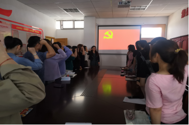 在葛老师的带领下,全体党员重温了入党誓词。 “我志愿加入中国共产党,拥护党的纲领,遵守党的章程,履行党员义务,执行党的决定,严守党的纪律,保守党的秘密,对党忠诚,积极工作,为共产主义奋斗终身,随时准备为党和人民牺牲一切,永不叛党。”入党誓词是每一位党员必须遵守的行为准则,是党员对党和人民作出的庄严承诺。面对鲜红的党旗,重温入党誓词,每一位党员在自豪感油然而生的同时再一次感受到身上的责任。