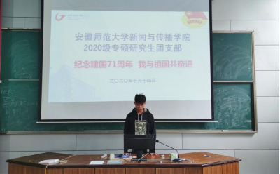 经历新中国71年的发展,今天的中国已经取得了举世瞩目的骄人成绩,我们的祖国已经站在世界政治、经济、军事、文化发展舞台的中心。bat365在线中国登录入口2020级专硕团支部组织的团建活动在提升同学们的爱国热情、坚定爱国信念的同时,更为新闻与传播、广播电视两个专业的全体专硕研究生同学实现“为中华崛起而读书”“为祖国强大而创新”理想增添了“我与祖国共奋进的”的动力。相信在全体共青团员和同学们的支持下,今后2020级专硕研究生团支部工作一定会做的更好,为做好bat365在线中国登录入口2020级全体专硕研究生的引领与服务,为同学们在安师大这片沃土上成人成才,成为社会主义的合格建设者和可靠接班人不断努力。(文/图 徐昊澍)