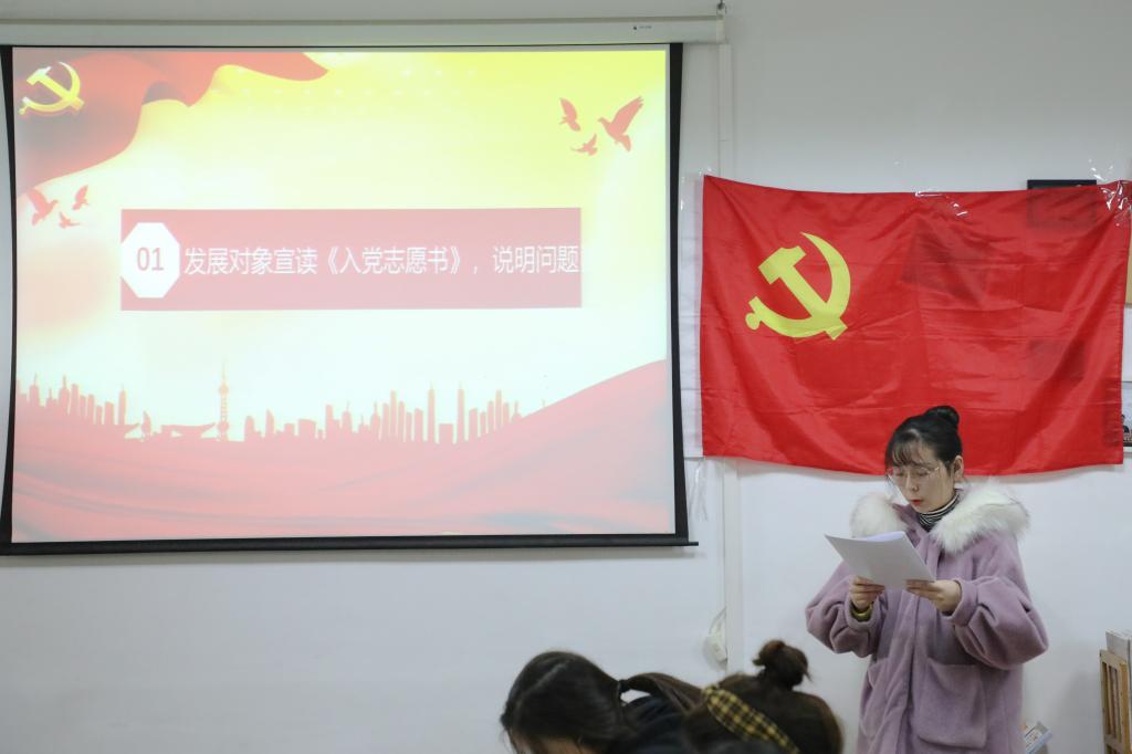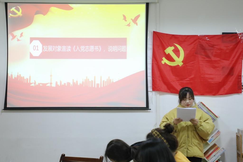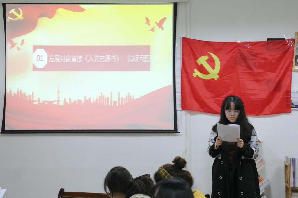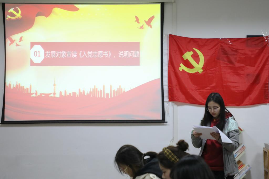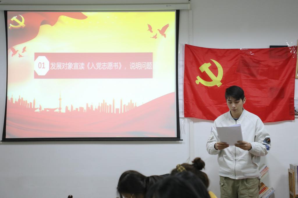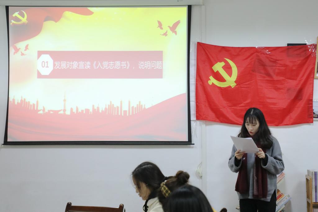 支部书记刘熠宣布会议开始并报告此次支部大会出席会议的人数,提出会议议题、议程以及会议的具体要求。本次大会的主要内容是讨论和接收第二批预备党员,戚梦媛等14名发展对象逐个向大会宣读入党志愿书,组织委员马星宇分别评价了14名发展对象的主要情况,并对其能否入党表明了意见。刘熠向大会报告了对申请人的培养过程及审查情况,18级预备党员赵梦婷等同志听取发展对象汇报并进行广泛讨论。