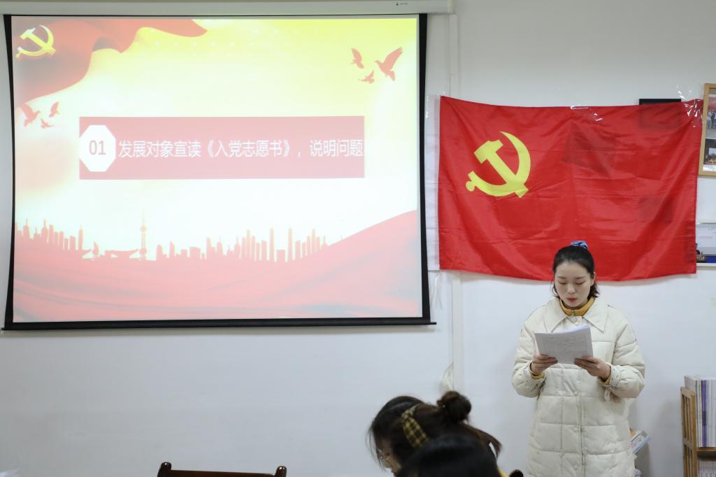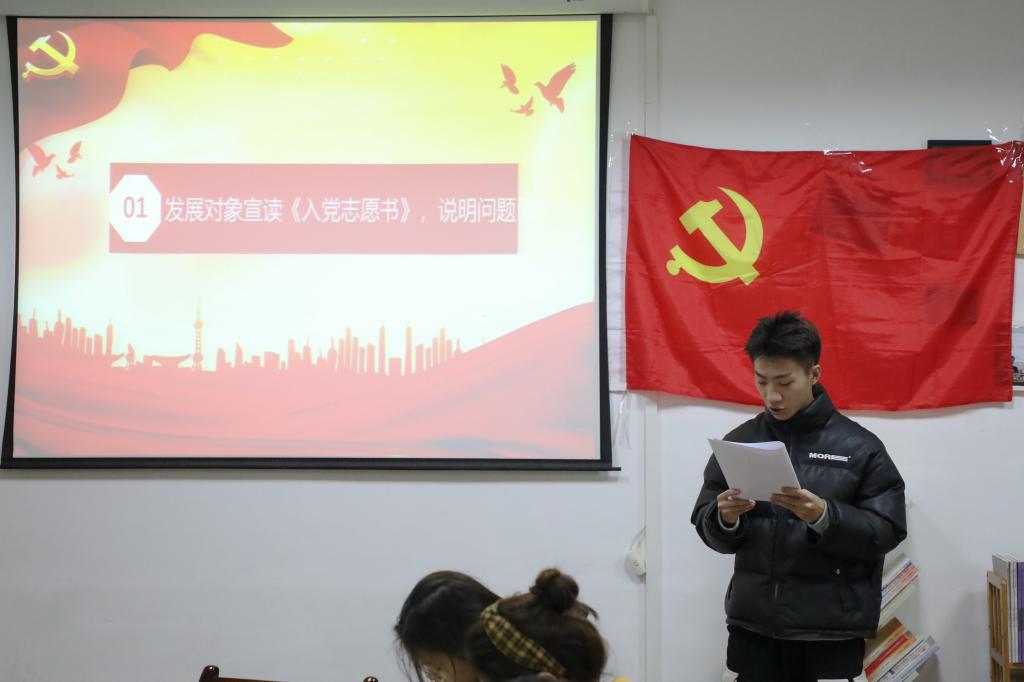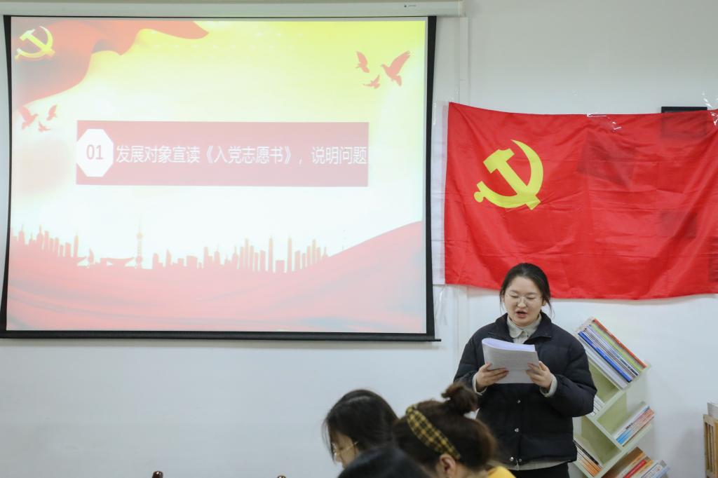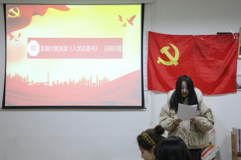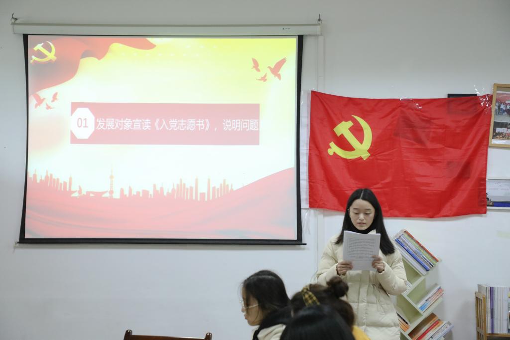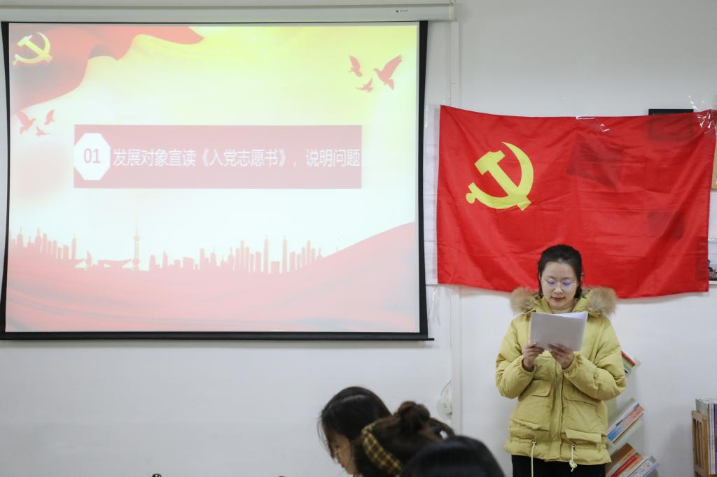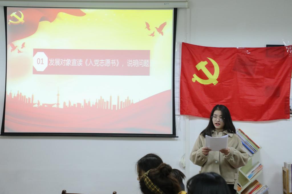 支部书记刘熠宣布会议开始并报告此次支部大会出席会议的人数,提出会议议题、议程以及会议的具体要求。本次大会的主要内容是讨论和接收第二批预备党员,戚梦媛等14名发展对象逐个向大会宣读入党志愿书,组织委员马星宇分别评价了14名发展对象的主要情况,并对其能否入党表明了意见。刘熠向大会报告了对申请人的培养过程及审查情况,18级预备党员赵梦婷等同志听取发展对象汇报并进行广泛讨论。