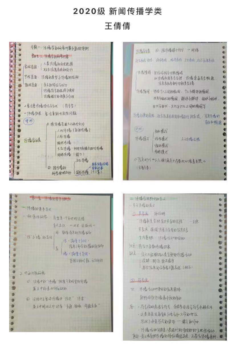 活动结束后,参赛同学对本次活动反响热烈。2020级新闻传播学类专业的参赛选手王倩倩同学在参赛后表示:“参加最美笔记大赛是我的一段‘水到渠成’的经历,因为我的笔记会一直记下去,而笔尖的温度也会让课堂的学习更有意义。手写笔记是我一直以来的习惯,把课上所听所想都整齐地写在笔记本上是一件很有成就感的事情,课后翻阅起来也是满满的收获,手写永远是我心中最有魅力的记录。”