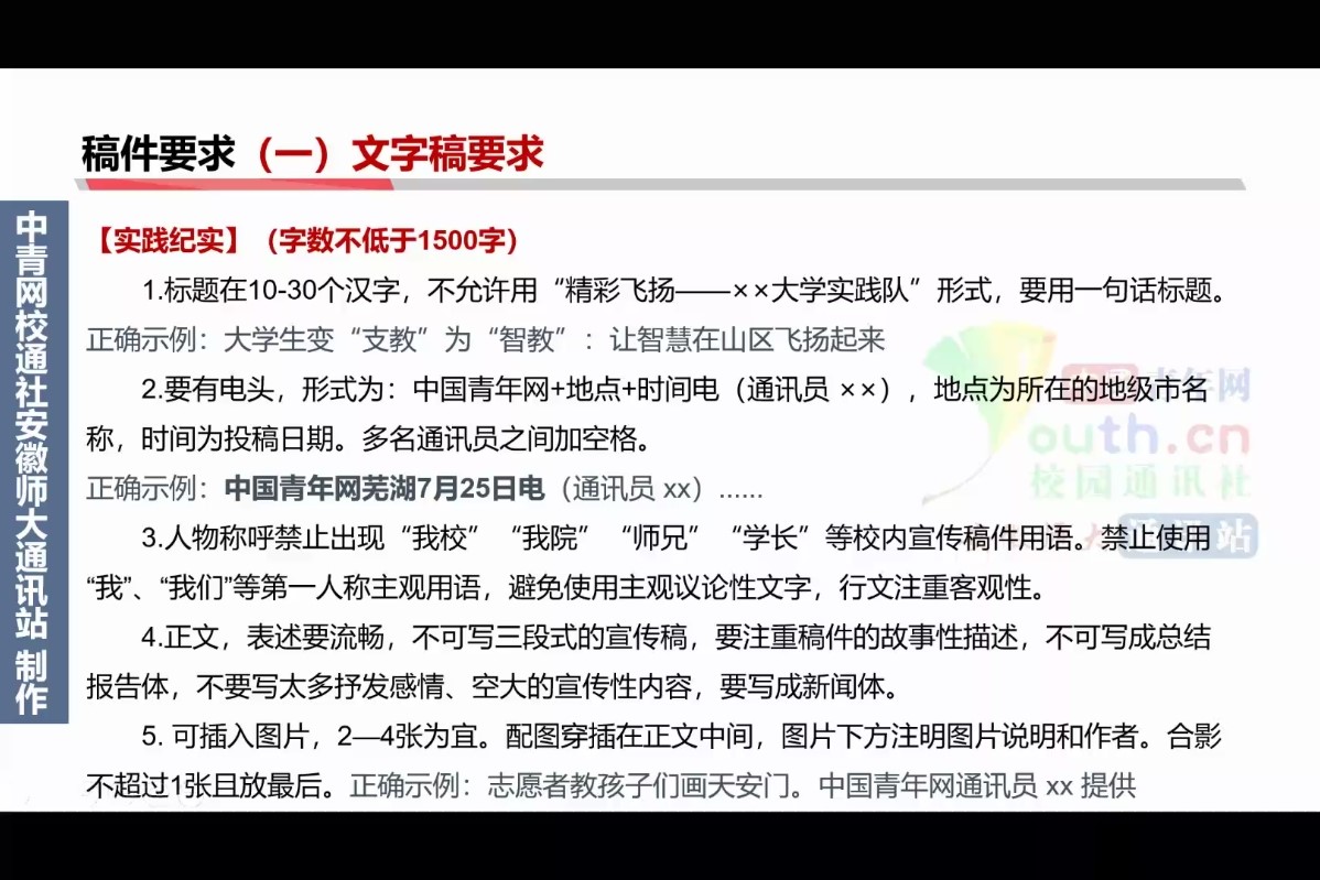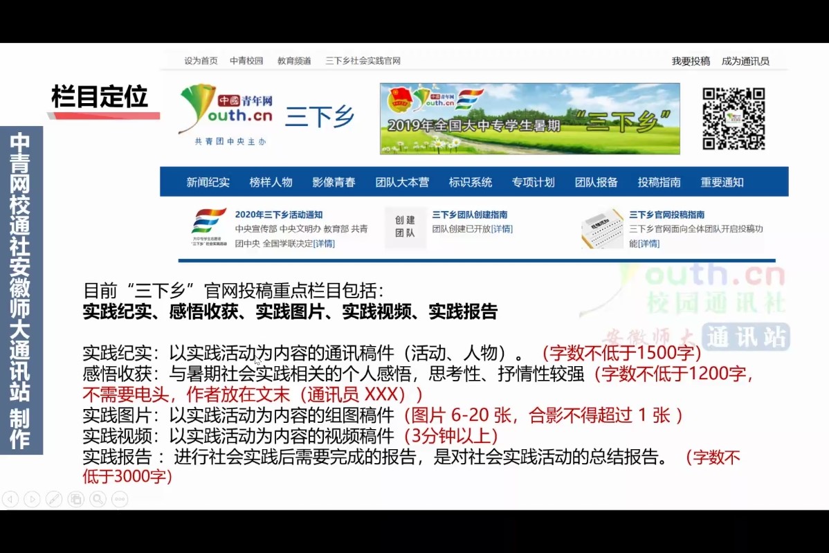 李林向各支暑期社会实践队伍分别介绍了关于中国大学生在线bat365在线中国登录入口校园通讯站投稿的前期要求、投稿方式和稿件审核等工作,钱佳佳为各支队伍做了关于中国青年网三下乡活动的专题培训,从培训导入到平台介绍、从栏目定位到团队报备细致地为同学们介绍了活动的前期工作和中期要求,其中着重指出了稿件成功发表的三个基本要求,强调出“实践纪实”的重要性。