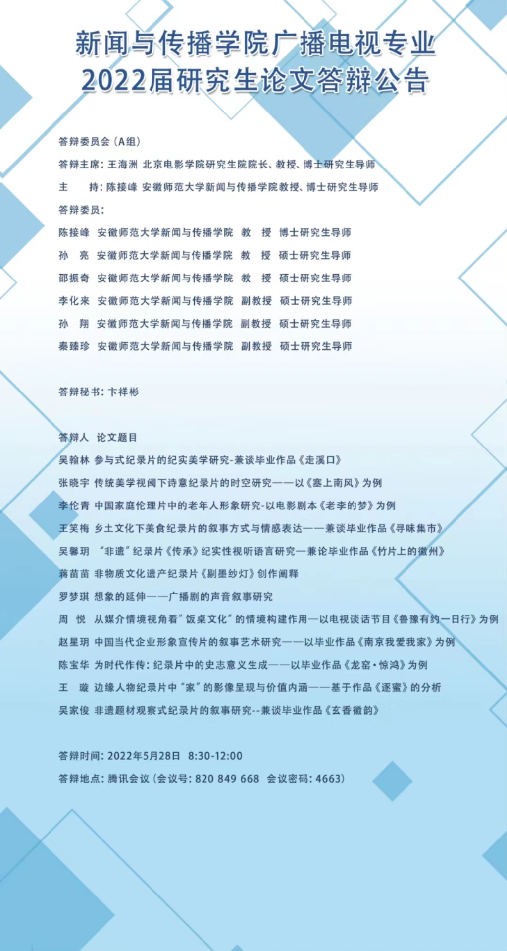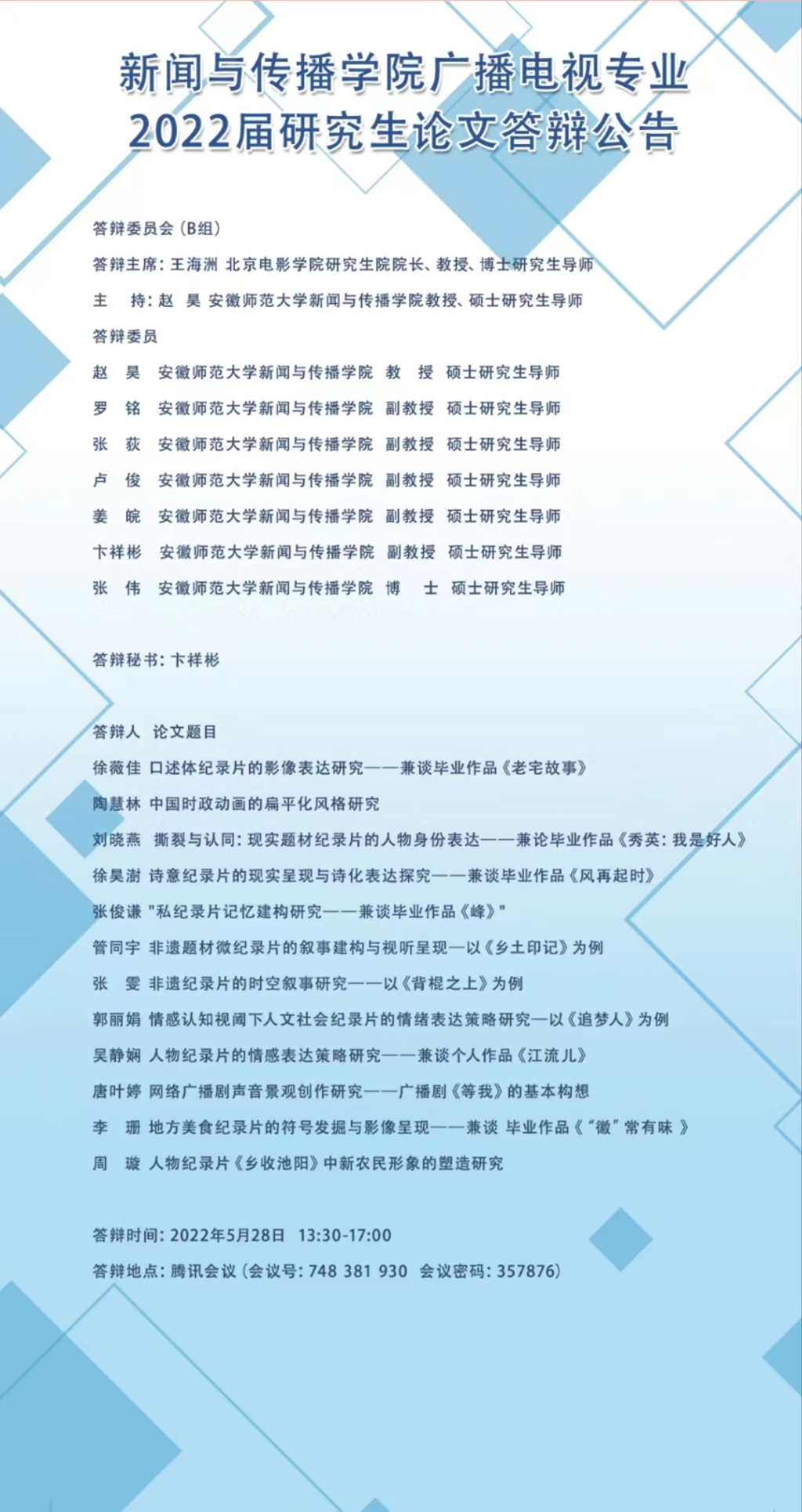 bat365在线中国登录入口 广播电视专业2022届研究生论文答辩公告