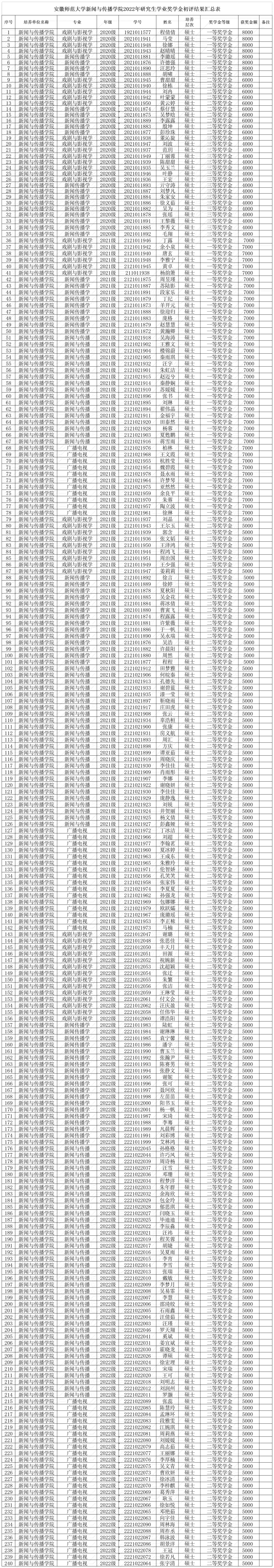 根据财政部教育部人力资源社会保障部退役军人部中央军委国防动员部《学生资助资金管理办法》(财教〔2021〕310号)、安徽省财政厅 教育厅 省人力资源和社会保障厅 省退役军人事务厅 省军区动员局《安徽省研究生学业奖学金实施细则》(皖财教〔2019〕914号)和bat365在线中国登录入口学业奖学金评审通知文件以及bat365在线中国登录入口2022年研究生学业奖学金评审细则等文件要求,学院成立研究生学业奖学金评审工作领导小组,严格按照公平、公正、公开的原则进行评审,现对评选推荐结果进行公示,公示时间为(2022年10月17日-10月21日),公示五个工作日,公示期内如有异议,提倡实名拨打0553-5910917或发送邮件至ahnuxinwen@163.com。