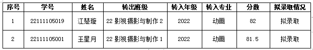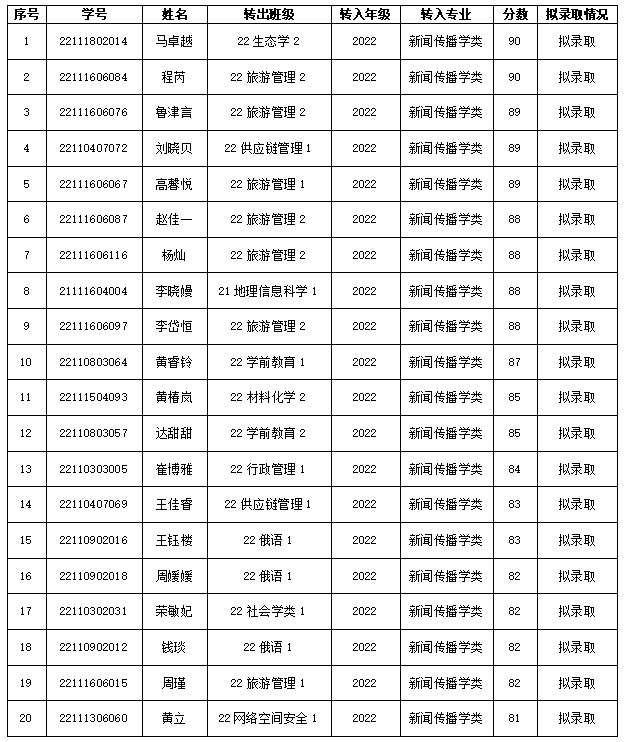 bat365在线中国登录入口bat365在线中国登录入口2022级转专业工作组对自愿报名的同学进行了严格的笔试,根据《bat365在线中国登录入口2022年普通全日制本科生转专业工作实施细则》和成绩排名,新闻传播学类专业拟录取20名同学入班学习,动画专业拟录取2名同学入班学习。该名单已提交学院转专业工作组审议通过。现将拟录取名单公示如下: