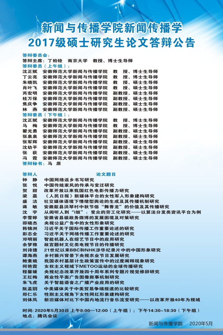 【研究生答辩】bat365在线中国登录入口新闻传播学2017级硕士研究生论文答辩公告