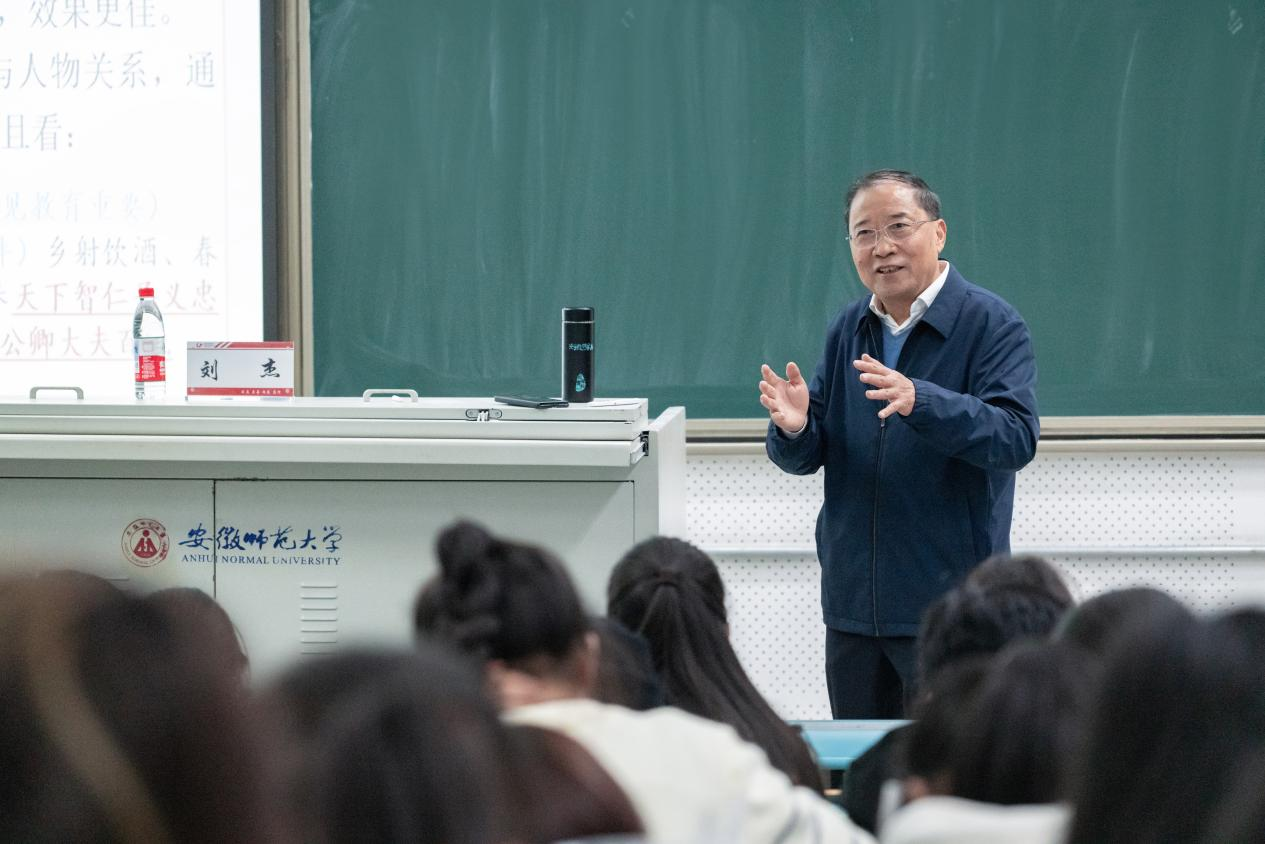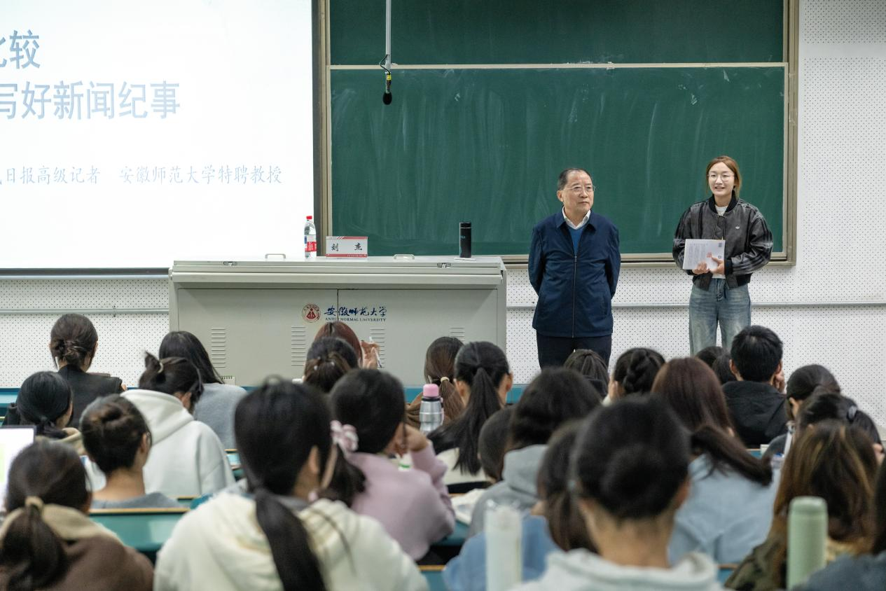 11月5日至6日,bat365在线中国登录入口品牌系列活动“刘杰新闻故事汇—国学与新闻写作系列”课程第二讲,在行知楼2070401教室顺利开讲。本次系列课程由我校特聘教授、人民日报安徽分社原社长、高级记者刘杰主讲,第二讲以“古今比较,如何写好新闻纪事”为主题,系统拆解新闻纪事写作的核心要点。学院教师要欣委、辅导员郭锦怡与学院各年级本科生、研究生到场学习,现场交流氛围活跃热烈。