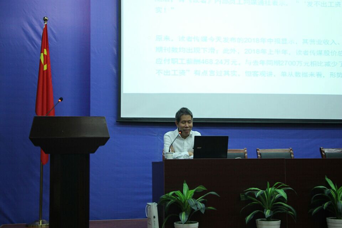 可感的凉意已经渗入了芜湖的初秋,刘海明教授讲座伊始就感叹道,“这也正是传媒业现在正处的季节啊”,他从近日《纽约时报》创刊167周年,到《北京晨报》才走过20年就停刊,在对比之中抛出了我国媒体陷入困境的问题,引发同学们思考。
