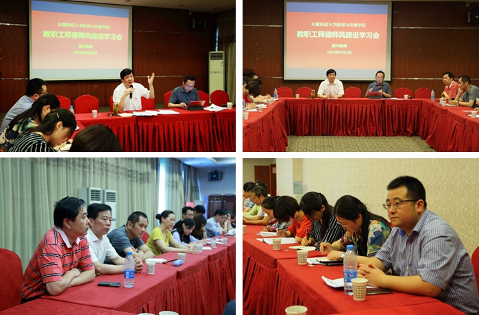 傍晚,学院党委还在驻地会议室召开“教职工师德师风建设学习会”,院长杨柏岭主持会议并作了讲话。院党委书记胡靖首先传达解读了教育部关于高校育人标准的几个通知文件。胡靖表示,抓好党建是为了促发展,加强师德师风建设是永恒的主题,学院要正视教师存在的一些问题,高度重视,认真解决,要引导教师把教书育人和自我修养结合起来,做到以德益生、以德益学、以德施教。他指出,新传的学院文化越来越突显,学院院风越来越纯正,师德师风越来越好转。新传院教师队伍之所以能做到师德师风建设越来越规范,简单概述为“一大、二公、三正、四亲”,这四个方面分别体现为大目标、立公心、党风正、教师亲。他强调,要从抽象与具体、物质与精神、历史与时代、利他与利己、个体与群体五大关系全面而深入地领悟师德师风建设的重要性。他强调,每个老师的改变就会影响整个学院,凝心聚力汇成一片江河,全体新传教师要努力传承师德师风,为bat365在线中国登录入口做出自我贡献。杨柏岭在主持时表示,学院党委高度重视师德师风建设学习教育,教风、学风建设改进明显。他以bat365在线中国登录入口90周年校庆为例,充分肯定了学院师生团队幕后的出彩表现和自觉奉献。他强调,作为一名人民教师,要把握好方向,自觉践行社会主义核心价值观,要深刻领悟新全方位的、立体的十个育人标准。他要求全体教师齐心协力共建学院的育人环境,不断优化育人生态。