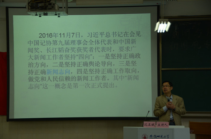 “2016年11月7日,习近平总书记在会见中国记协第九届理事会全体代表和中国新闻奖、长江韬奋奖获奖者代表时,要求广大新闻工作者坚持“四向”:一是坚持正确政治方向,二是坚持正确舆论导向,三是坚持正确新闻志向,四是坚持正确工作取向,做党和人民信赖的新闻工作者。其中“新闻志向”这一概念是第一次正式提出。”讲座伊始,沈正赋教授立足中外,引经据典,从多个维度对“新闻志向”的内涵进行了阐释,并对新闻志向的概念进行了解读:新闻志向就是指新闻工作者把新闻工作当作事业和志业,并为之进行策略性努力的一种新闻职业精神、个人成名想象和人生价值取向。