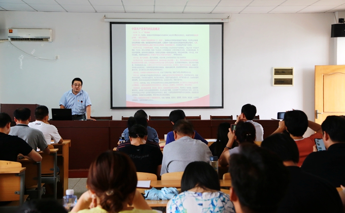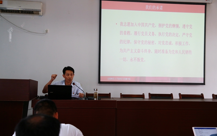 上党课环节,院党委书记张师帅以“如何做一名合格党员”进行专题党课。他从“我们的承诺”——入党誓词开篇,从合格标准、客观现实、实现途径三个板块,结合新时期合格党员标准,分别从政治合格、守纪合格、品德合格、履职合格“四合格”,对讲政治、有信念,讲规矩、有纪律,讲道德、有品行,讲奉献、有作为“四讲四有”进行了系统的剖析。党课中,他引经据典,并结合学院党支部建设、专业建设、学科建设、学位点建设、院风建设过程中的出现典型事例,生动的说明如何做一名合格党员,一名合格的党员应该为学院的发展做些什么。提出以加强学习、积极实践、持之以恒为内容的实现当一名合格党员的途径。他号召大家,作为新时期的党员,只有时刻注意自己的言行,始终保持谦虚谨慎、不骄不躁的作风,不断培养高尚道德情操,努力砥砺优良道德品质,以诚居心,处世端正,才能无愧于“合格党员”的称号。