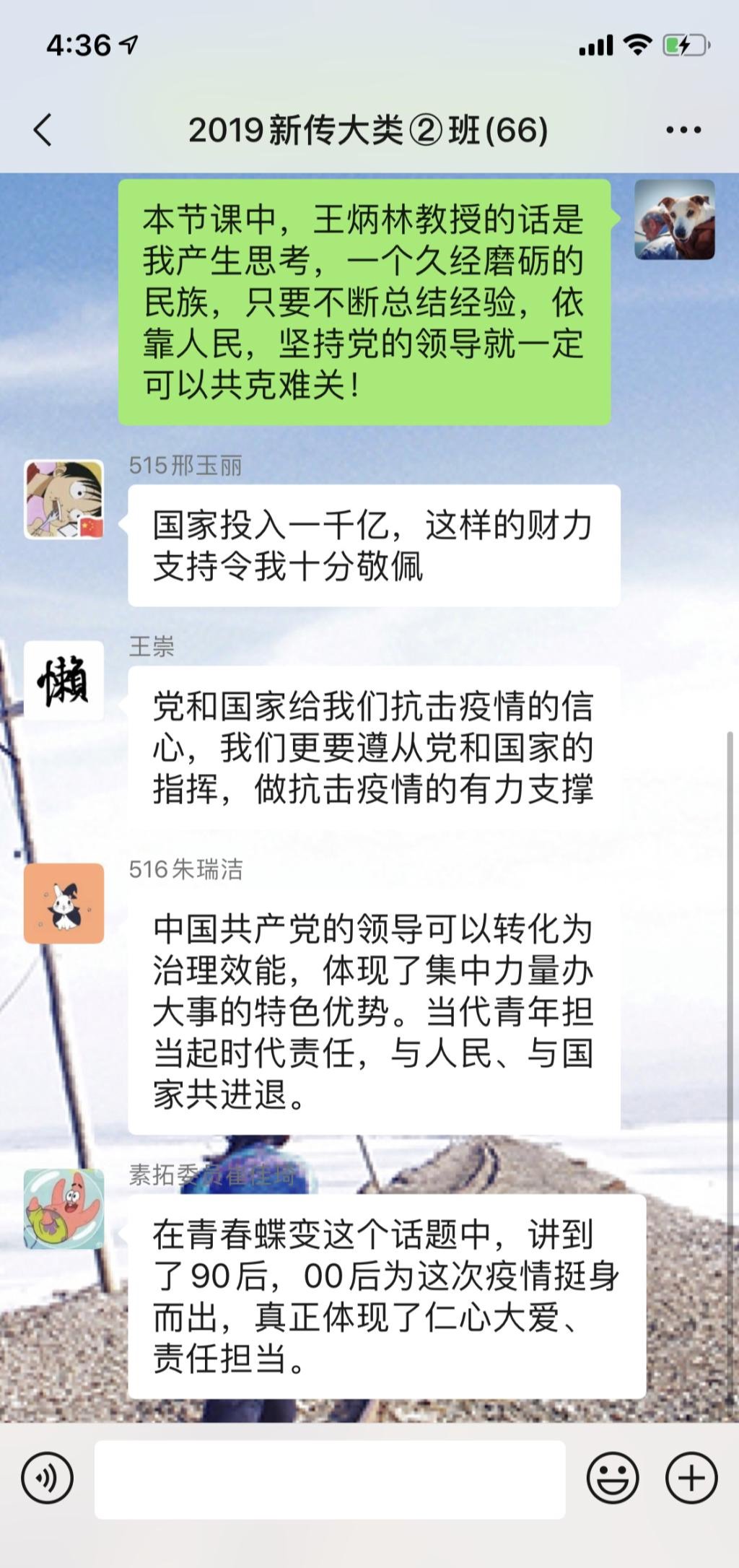 2016级新闻学专业丁纪:听完思政课,在教授们详细的描绘中,我深刻地认识到在新冠肺炎疫情发生时国家做出的努力。从火神山雷神山医院的建立,到全国各地的医护人员聚集湖北,中国共产党始终把人民群众生命安全和身体健康放在第一位。也是在全中国人民的共同努力下,如今疫情得到了有效的控制。相信经历这次疫情的磨难,中华民族必将吸取历史经验教训,为今后更加理智地面对灾难,更加成熟地采取危机应急措施奠定基础。