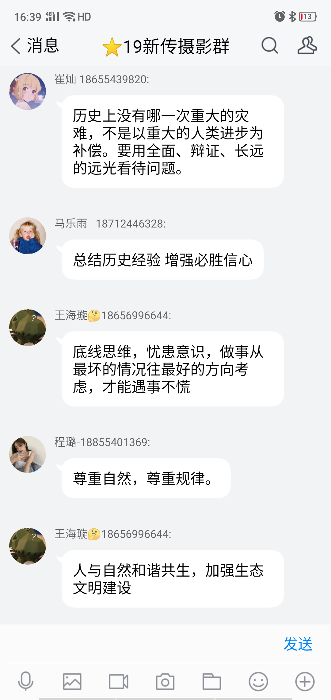 2018级新闻与传播专业研究生冯晓敏:在这场疫情防控中,我能够感受到社会主义集中力量办大事的优势,社会各界纷纷投入到疫情防控中,其中也有许多普通党员的身影。作为一名学生党员,我们应该努力贡献自己的一份力量,不信谣不传谣,不为社会增加负担。在家也要制定好学习计划,学习不止步。就如这堂课上所说,新时代青年要肩有大任,要勤学奋斗、增长才干,才能用科学精神和专业本领保护我们想保护的人。