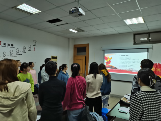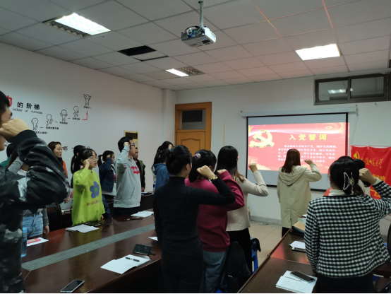 宣誓大会上,全体起立,会议在庄严的《国际歌》歌声中开始。随后,张瑶作为领誓人,面向党旗,带领全体参会党员进行了宣誓。崔悦代表支部新发展的预备党员,就近期的思想、学习与生活等情况作了详细汇报。